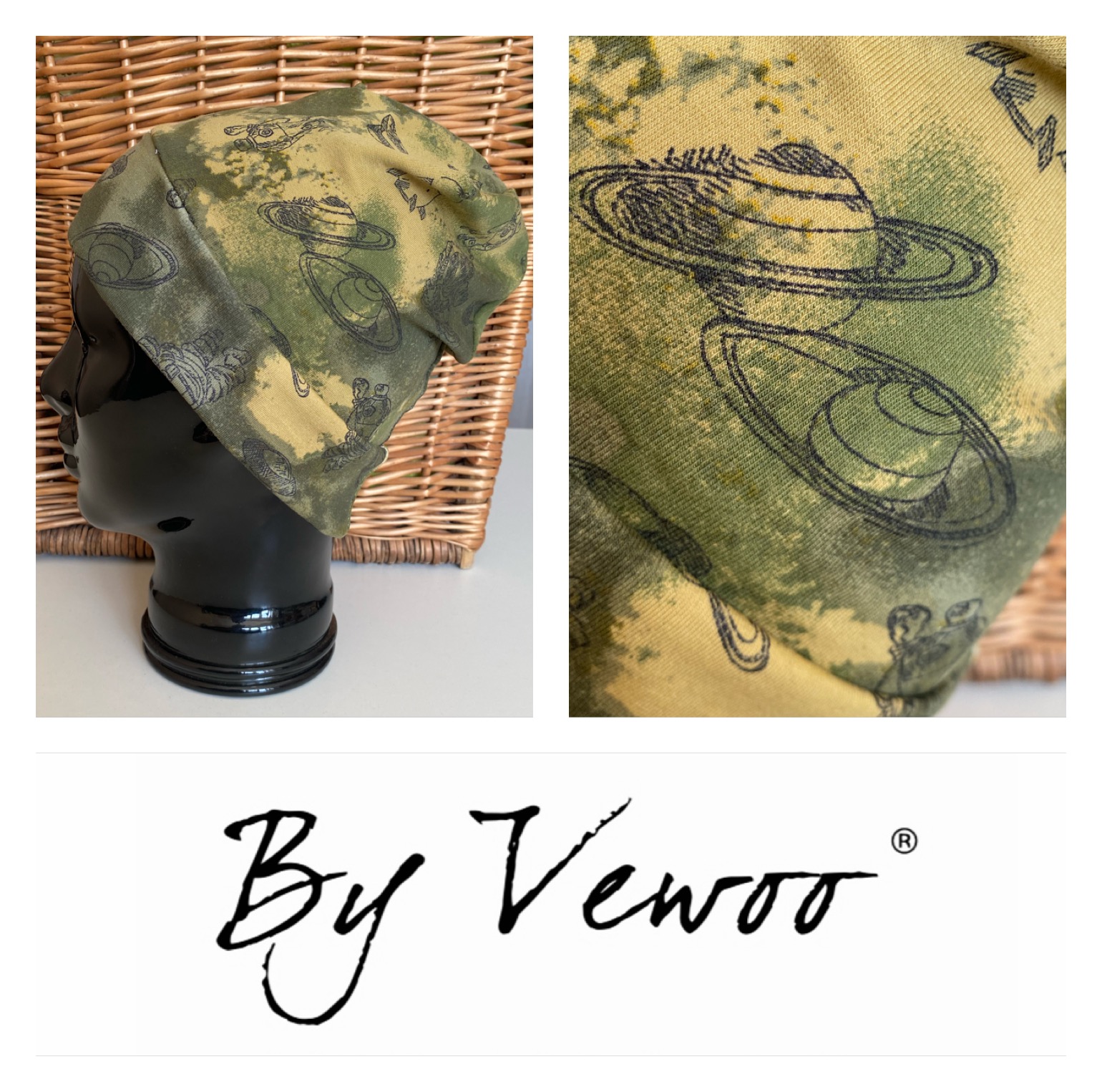 Čepice s dvojitým lemem kolem uší - lehký bavlněný úplet - vzor KOSMONAUTI/VESMÍR NA ZELENÉ - velikost 50-56cm->SKLADEM<- k odeslání ihned 1 ks200 Kč/ ks